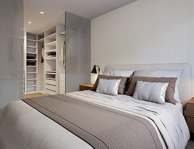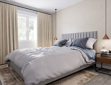 - → Dormitorio principal en suite, con vestidor y baño privado, diseñado como un espacio íntimo y cómodo.