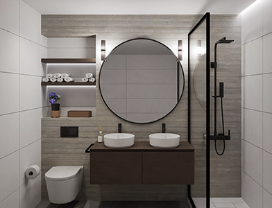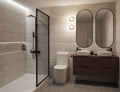 - → Suelos porcelánicos, carpintería lacada, iluminación led y materiales seleccionados con criterio estético y durabilidad.